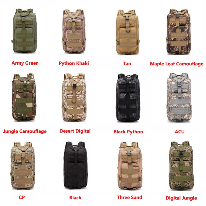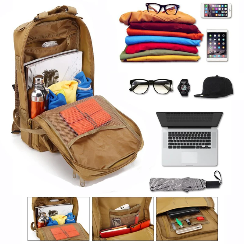 20–25L capacity with multiple compartments and MOLLE webbing