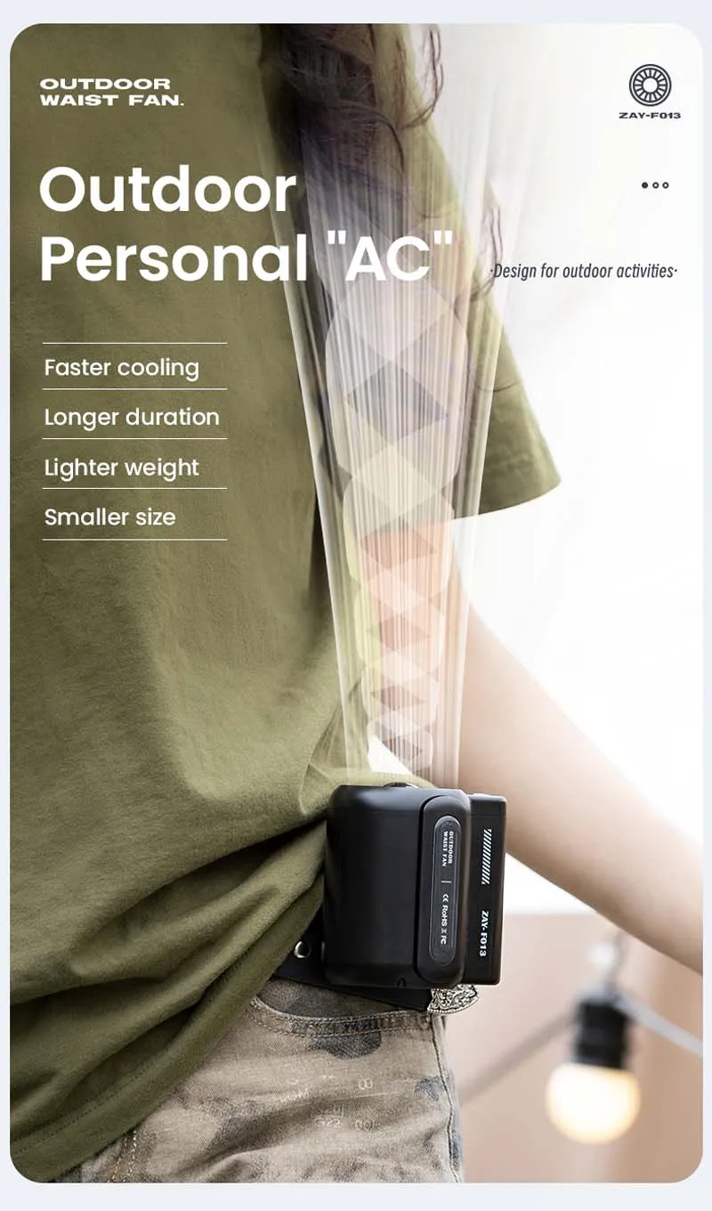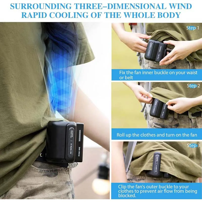 Equipped with a built-in rechargeable battery, this waist fan charges easily via USB. As a result, you can power it up at home, in your car, or with a portable power bank while on the go. Additionally, the long-lasting battery ensures hours of continuous cooling.