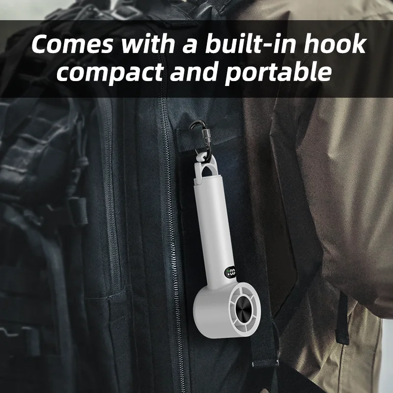 Mini Handheld Turbo Fan – Portable USB Rechargeable Fan with Hook, LED Display & Desktop Stand for Outdoor and Camping