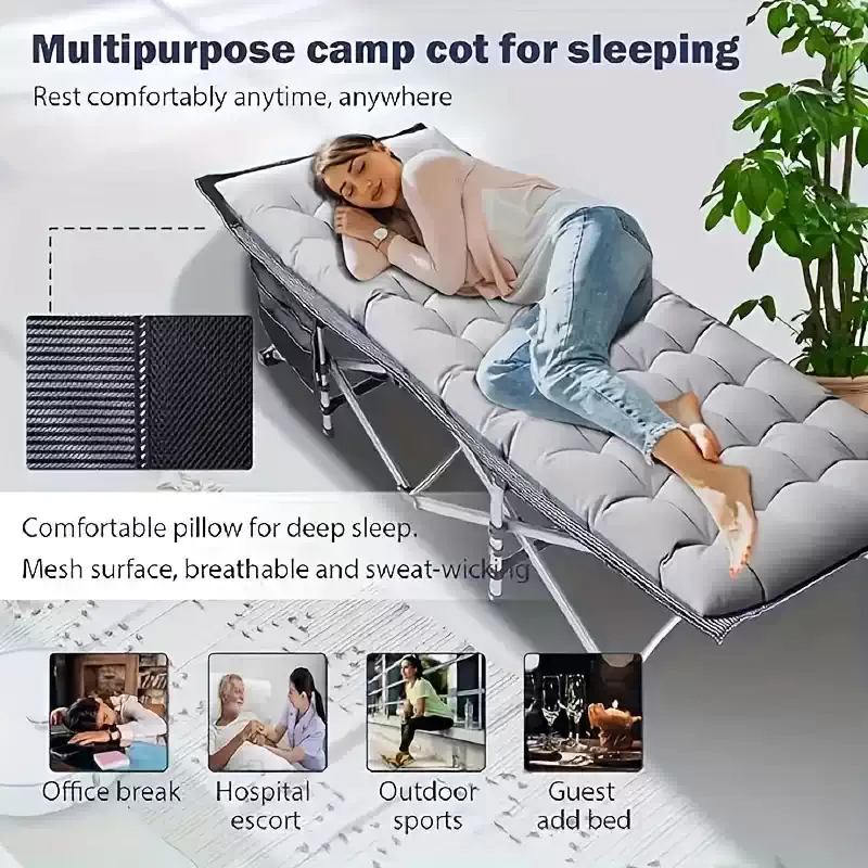 Our 75-inch large folding sports outdoor bed is the ultimate solution for premium comfort on the move. We designed this portable foldable guest bed to bridge the gap between rugged camping gear and luxury home furniture. Featuring a high-strength steel frame, it provides full-body support for adults up to $6\text{ ft }3\text{ inches}$. This product meets the “Breakout” demand for camping mats for tents by offering an elevated sleeping platform that keeps you away from the cold, damp ground. Whether you are using it as a stadium bed for events or an extra bed for visitors, it offers a sturdy, noise-free sleeping experience.