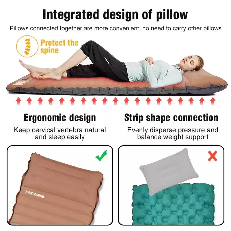 If you are planning a trip with a 2 person tent, you will find that the splicing feature maximizes your available floor space. Furthermore, it serves as a reliable travel bed for self-driving travel or as an emergency guest pad. The integrated air pillow also allows you to adjust the firmness to your liking. Finally, we include a compact compression bag to make storage effortless. Upgrade your outdoor kit with this thicken sleeping pad today.