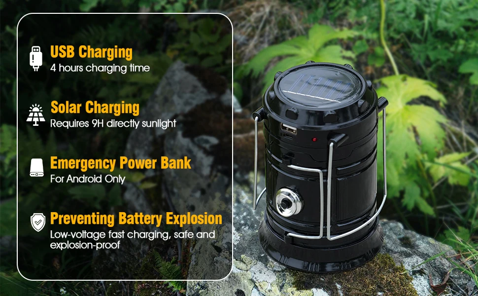 In conclusion, the Solar Camping Lantern combines solar charging, USB recharging, and a power bank into a single, portable light source. Its waterproof design and reliable performance make it the perfect companion for any outdoor adventure or emergency situation.