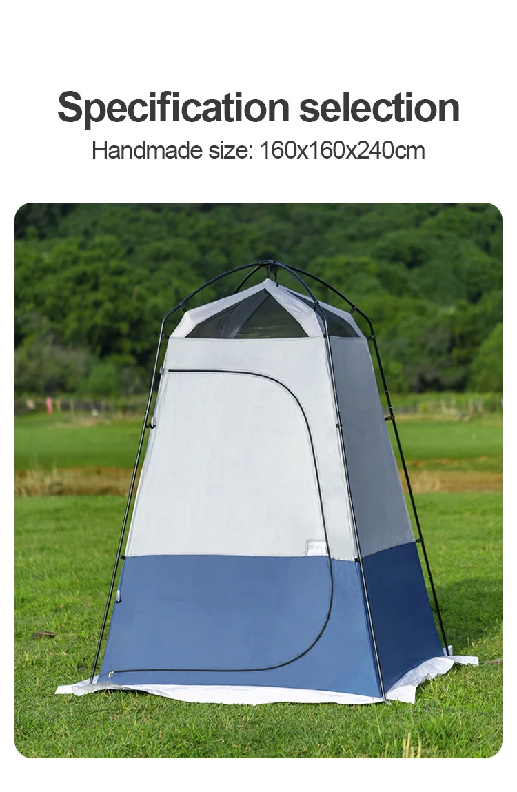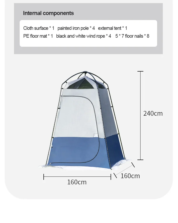 With dimensions of 160cm (length) x 160cm (width) x 240cm (height), the tent offers a comfortable space for standing, showering, changing, or using a portable toilet. Its tall height ensures even tall users can move freely inside, enhancing convenience during outdoor activities.
