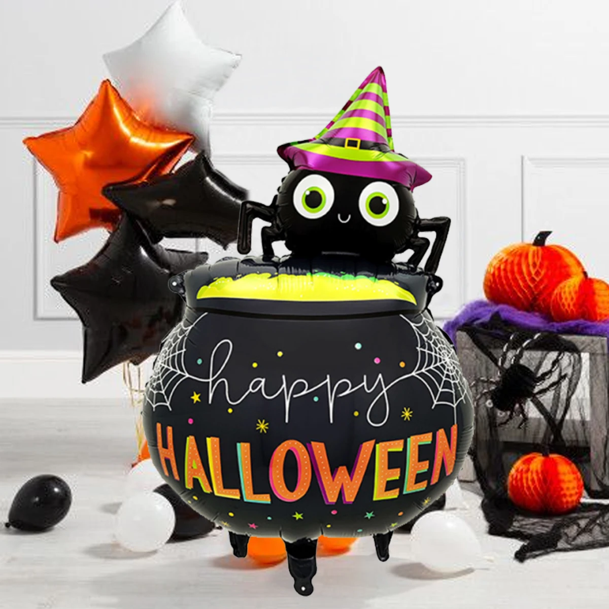 The balloon features a creative medicinal pot or cauldron shape, decorated with vivid spider patterns and eerie colors. Its design instantly enhances any horror-themed setup, making it a standout piece for haunted house parties, trick-or-treat setups, or spooky photo backdrops.
