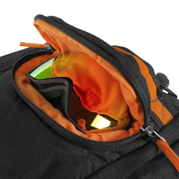 Ventilated boots pocket: The actual side pocket for storing your ski or snowboard boots is smartly constructed to keep them, as well as the rest of your gear, dry. The compartment has a waterproof, biodegradable PEVA liner, as well as four drainage and ventilation holes that allow snow to drain out rather than inside the bag and onto your luggage.